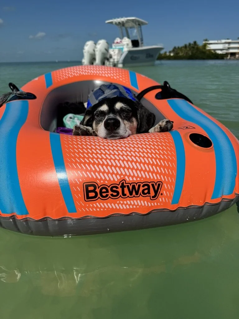 Rooney loves soaking up the sun, going on boat rides, floating in her own personal raft, and she takes her job of “find the fish” very seriously!